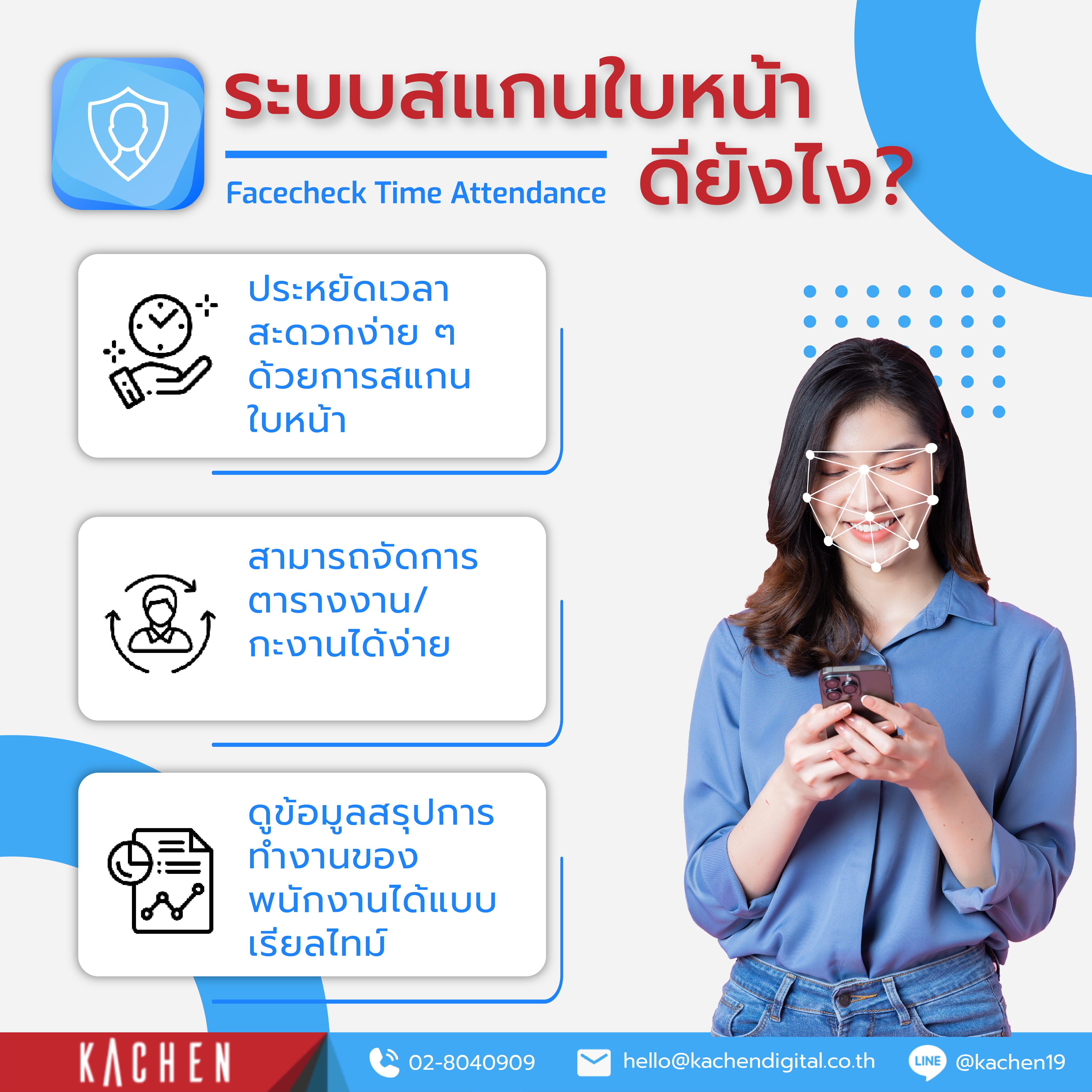 1. ประหยัดเวลาจากการเข้างานแบบเดิมด้วยการลงชื่อ หรือตอกบัตร สามารถทำได้ง่าย ๆ ด้วยการสแกนใบหน้าผ่านเครื่องมือ หรือแอปพลิเคชันบนโทรศัพท์มือถือ